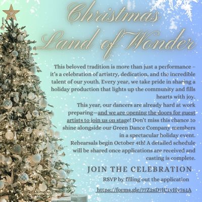 This year, our dancers are already hard at work preparing—and we are opening the doors for guest artists to join us on stage! Don’t miss this chance to shine alongside our Green Dance Company members in a spectacular holiday event.